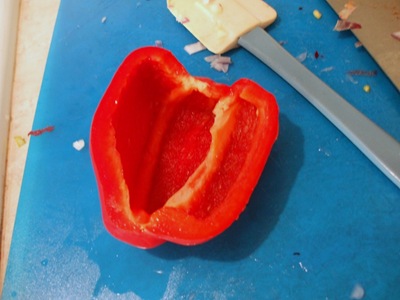 Next, take half a red bell pepper. Mmm, I love sweet red bell peppers. These make my kids run for the hills, even though I've proved several times that they are not hot. Sweet, not hot.